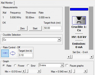 All of this is done automatically in the 'Xtal monitor' (see Fig.): by pressing 'Zero', the thickness is offset to 0.0 nm, by pressing 'Start', the same happens, but subsequently, the shutter opens and the system waits until the 'target thickness (nm)' is reached. After the thickness is reached, it will close the shutter automatically, ramp down the emission current of the e-beam and turn off the HV.
